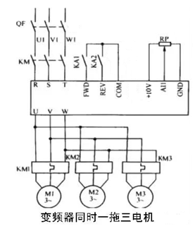 一臺變頻器同時帶幾臺甚至幾十臺電機,所有電機的速度都由同一臺變頻器的輸出頻率控制,理論上所有電機的速度是一致的,并且能保證同時升速與降速。