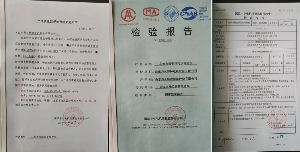 10月6號(hào),我們收到了國家中小電機(jī)質(zhì)量監(jiān)督檢驗(yàn)中心發(fā)來的《產(chǎn)品質(zhì)量監(jiān)督檢查結(jié)果通知單》和檢驗(yàn)報(bào)告,我們公司生產(chǎn)的這臺(tái)高效永磁變頻同步電動(dòng)機(jī)樣機(jī)經(jīng)過檢驗(yàn),所檢查項(xiàng)目符合GB/T755-2008旋轉(zhuǎn)電機(jī)定額和性能、GB30253-2013永磁同步電動(dòng)機(jī)能效限定值及能效等級(jí)、Q/1083SLJ018-2018TYP系列高效永磁同步電動(dòng)機(jī)、GB/T22670-2008變頻器供電三相籠型感應(yīng)電動(dòng)機(jī)試驗(yàn)方法等標(biāo)準(zhǔn),依據(jù)2019年永磁同步電動(dòng)機(jī)產(chǎn)品質(zhì)量國家監(jiān)督抽查方案,判定為合格。