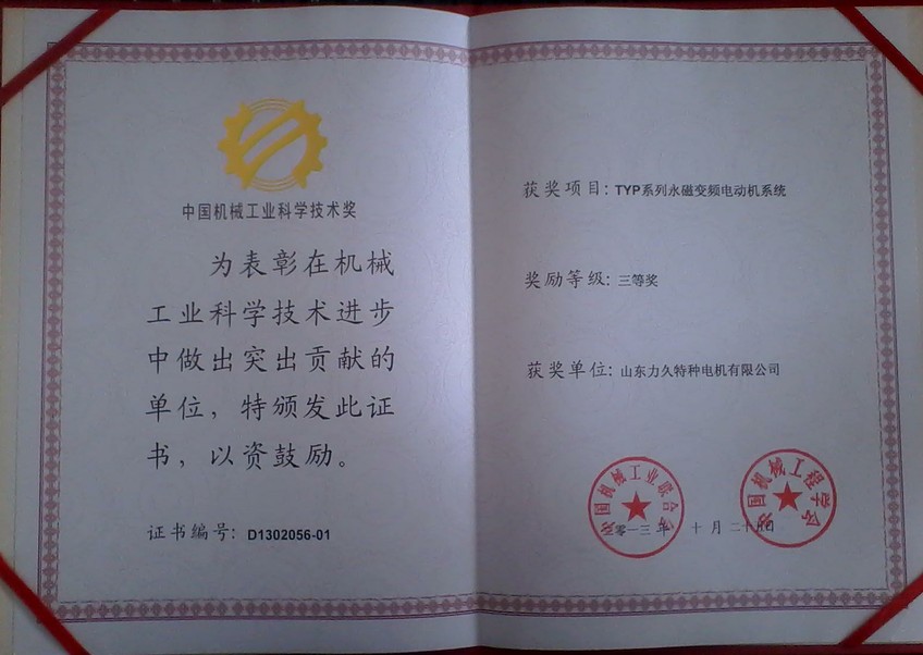 日前,山東力久特種電機有限公司從市科技局獲悉,由我公司研發(fā)完成的“TYP系列永磁變頻電動機系統(tǒng)”項目榮獲“2013年度中國機械工業(yè)科學技術獎”三等獎,這也是我市歷史上首次獲此殊榮。