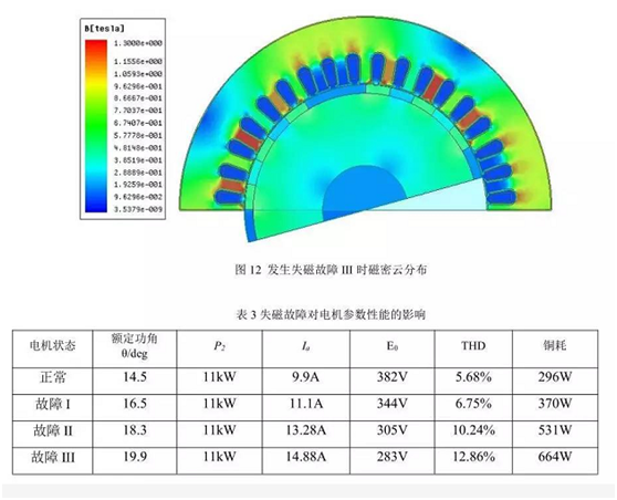 通過(guò)表3可以分析電機(jī)失磁后的感應(yīng)電動(dòng)勢(shì)幅值、頻譜以及其它參數(shù)的變化。從正常和故障情況下電機(jī)的空載特性對(duì)比來(lái)看,當(dāng)電機(jī)空載運(yùn)行時(shí),不可逆失磁發(fā)生的位置及失磁程度不相同時(shí),空載反電動(dòng)勢(shì)的幅值E0在失磁故障狀態(tài)下都是減少的,同時(shí)進(jìn)一步分析得到隨著故障程度的增加,反電勢(shì)的正弦總諧波畸變率THD有所增加。但因磁極仍然對(duì)稱,且采用分布短矩繞組,電勢(shì)波形仍然保持較好的正弦性。對(duì)于額定負(fù)載狀態(tài)下失磁故障對(duì)電機(jī)參數(shù)性能的影響,通過(guò)有限元結(jié)果可以看出,電機(jī)產(chǎn)生不可逆退磁后,除電機(jī)的空載反電動(dòng)勢(shì)E0減小外,其它參數(shù)包括定子電流、電機(jī)損耗以及功角都增加,電機(jī)的效率和穩(wěn)定性都有所下降。
