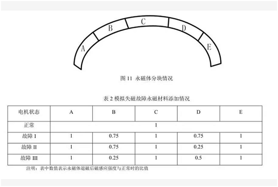 永磁體發(fā)生失磁有可能是局部的,也有可能是均勻的。為了模擬電機(jī)發(fā)生失磁故障狀態(tài),將電機(jī)的每一個(gè)瓦片形磁極任意分為A、B、C、D、E共5塊大小不等的小磁極,將不同磁感應(yīng)強(qiáng)度大小的永磁材料分配給每一塊小區(qū)域,用以模擬失磁故障的發(fā)生。