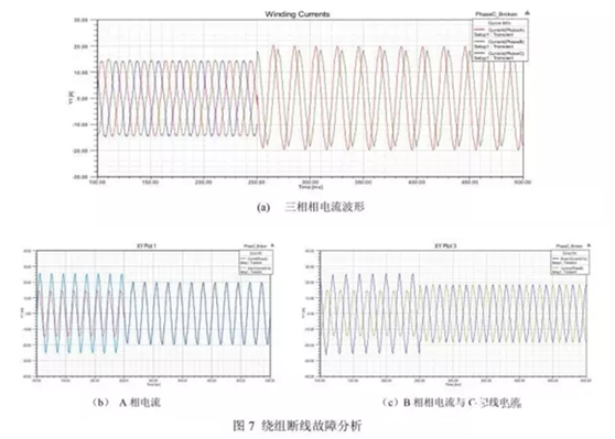 從結(jié)果來(lái)看,當(dāng)定子繞組C相斷線后,AB相繞組的相電流迅速增加,電機(jī)銅損增加,電機(jī)的輸出轉(zhuǎn)矩下降,帶載能力降低。故障發(fā)生后,A相相電流與線電流相等,C相相電流為零,但其線電流相位與B相相電流相差180度,幅值相等。因此,這一依據(jù)可以作為對(duì)定子某一相繞組斷線的故障特征,從而應(yīng)用于相關(guān)的故障診斷系統(tǒng)中。